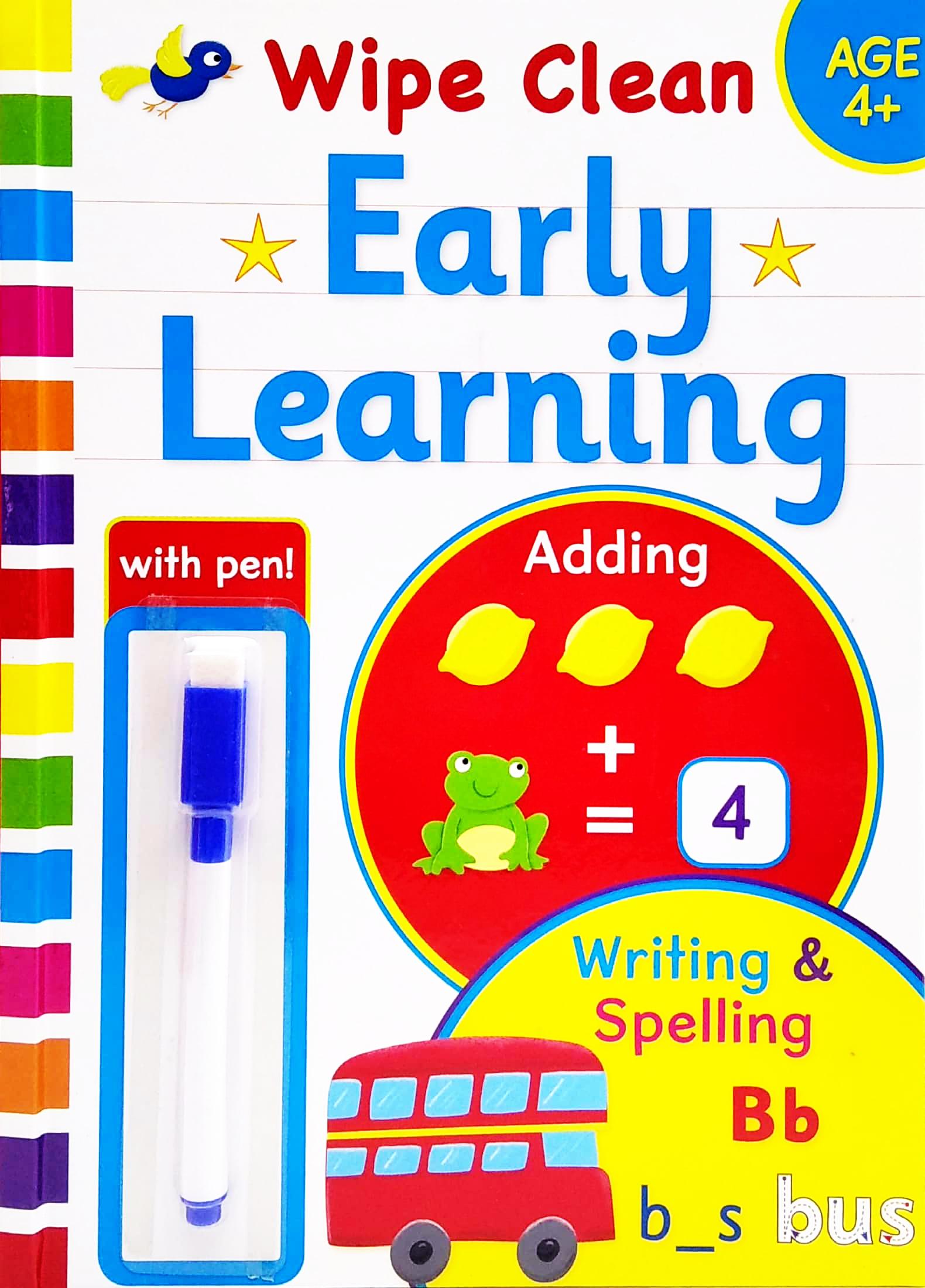 Wipe Clean Bind Up 4+ - Early Learning (With Pen) Practise writing, sums and spelling. Wipe away any mistakes with a damp cloth. With a wipe clean pen so you can practise again and again.