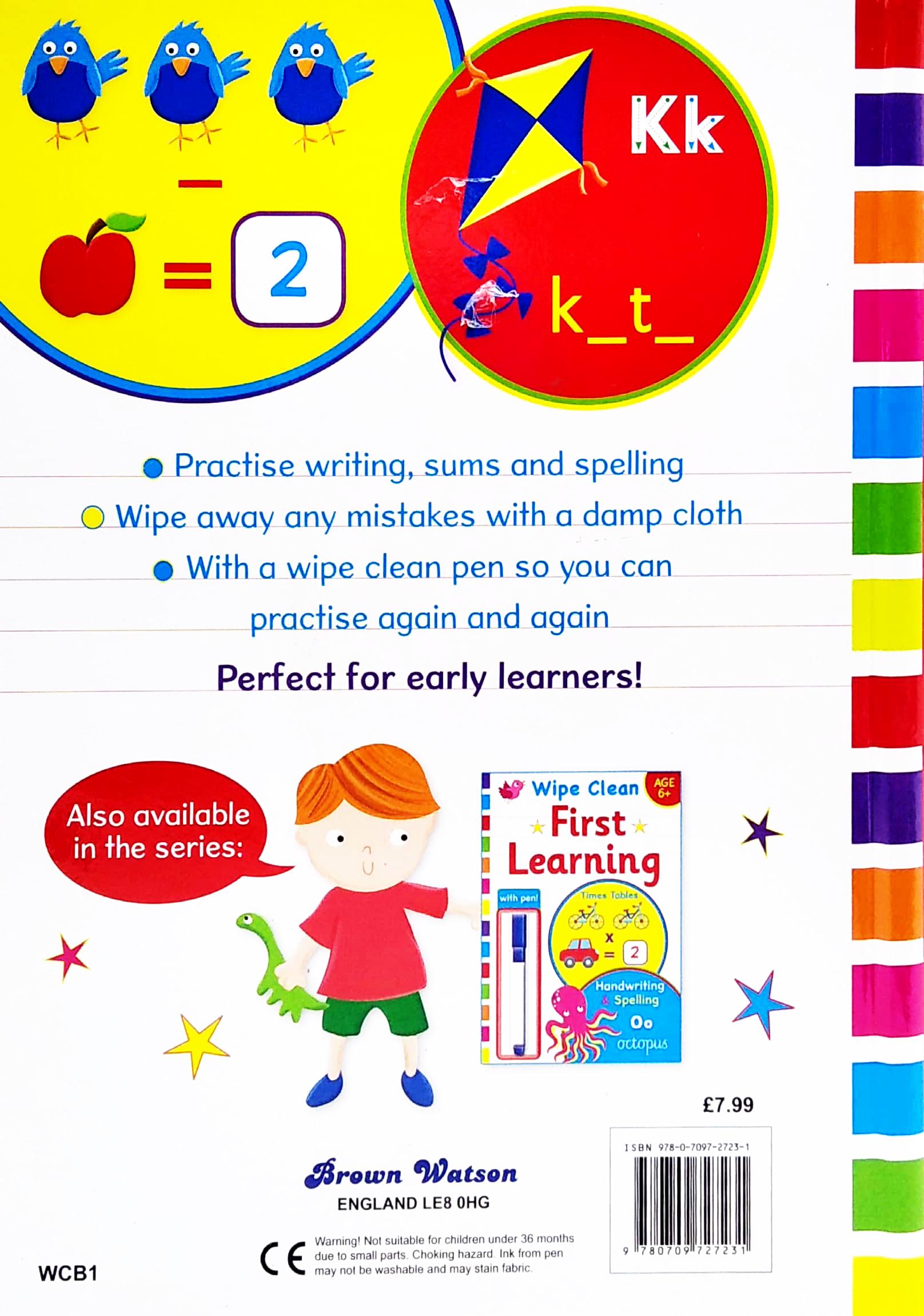 Practise writing, sums and spelling. Wipe away any mistakes with a damp cloth. With a wipe clean pen so you can practise again and again. Perfect for early learners!