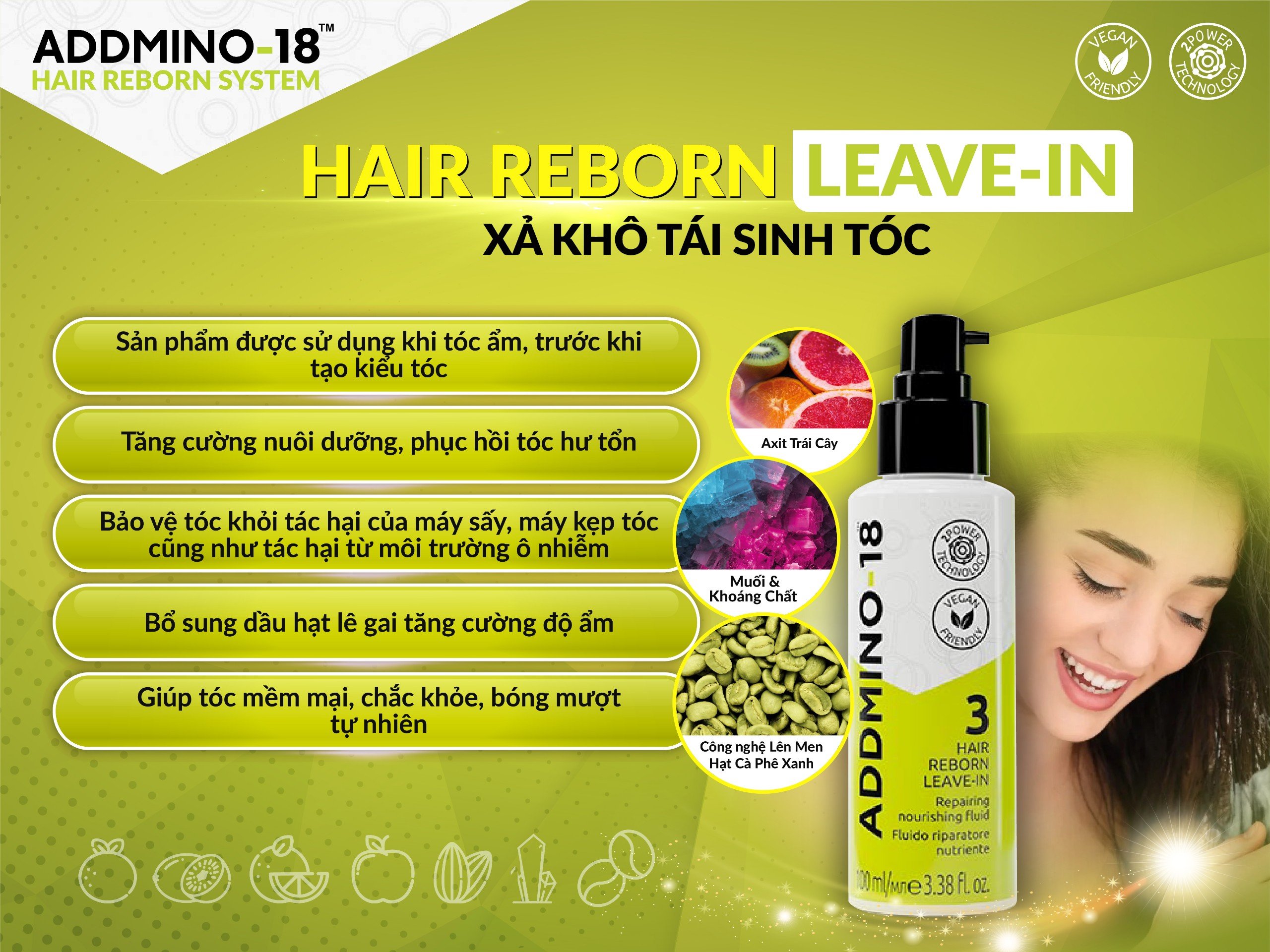 Xả Khô Tái Sinh Tóc Addmino - 18 3 Hair Reborn Leave - In Chăm dưỡng tóc chuyên sâu. Với công thức giàu thành phần acid trái cây, muối khoáng và hạt café xanh xanh