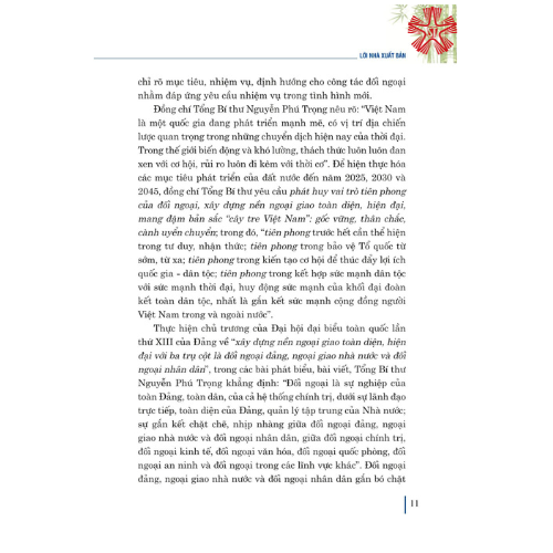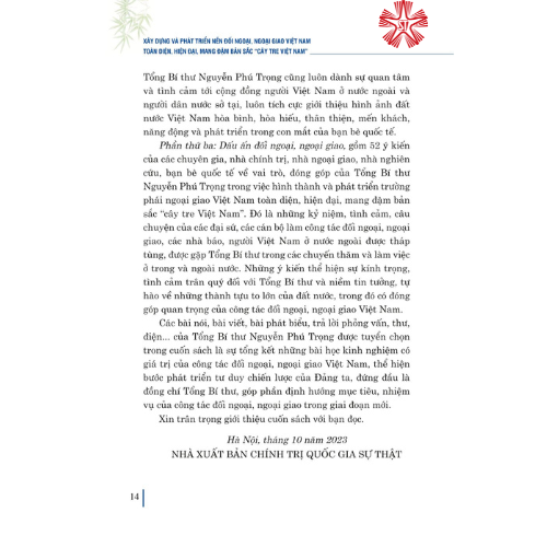 Cuốn sách Xây dựng và phát triển nền đối ngoại, ngoại giao Việt Nam toàn diện, hiện đại, mang đậm bản sắc “cây tre Việt Nam” của Tổng Bí thư Nguyễn Phú Trọng tuyển chọn một số bài nói, bài viết, bài p...