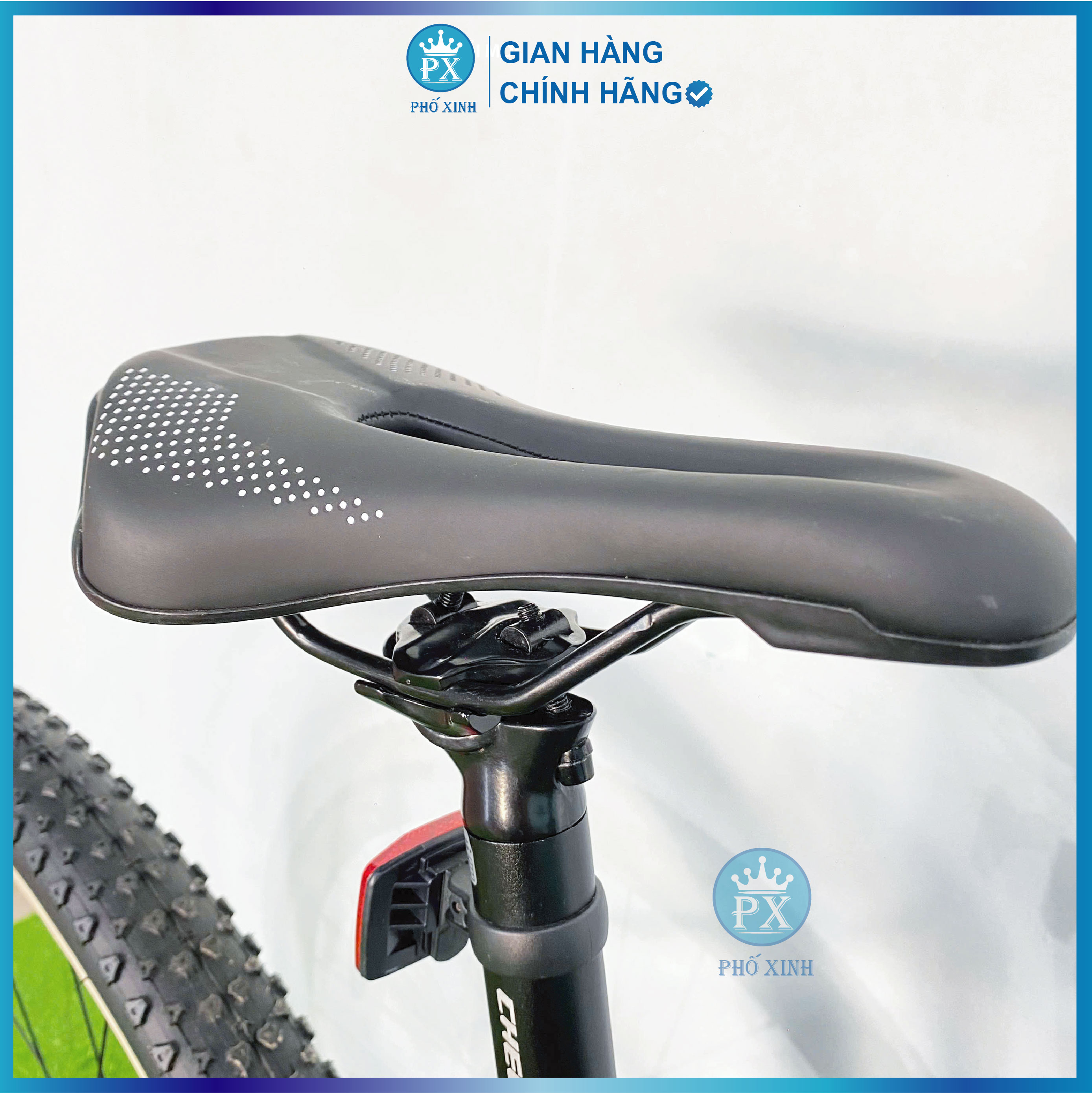 Yên được làm nệm mút cao cấp, êm ái. Cọc yên hợp kim chắc chắn mang lại cảm giác thoải mái cho người đạp xe khi di chuyển những cung đường dài, gập ghềnh.