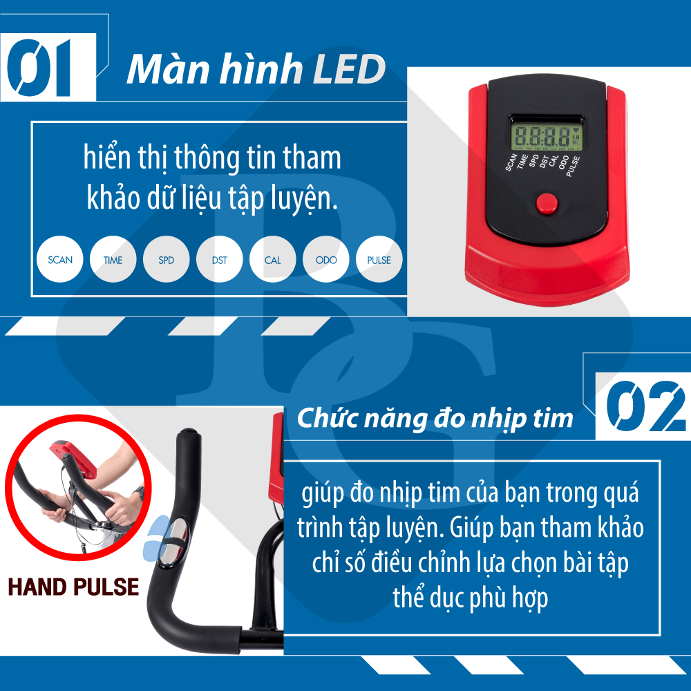 Trọng lượng tối đa người sử dụng: 125kg Cốt thanh tay cầm và yên xe bằng crom Màn hình LED hiển thị trực quan, dễ dàng quan sát Trang bị giá đựng chai nước và