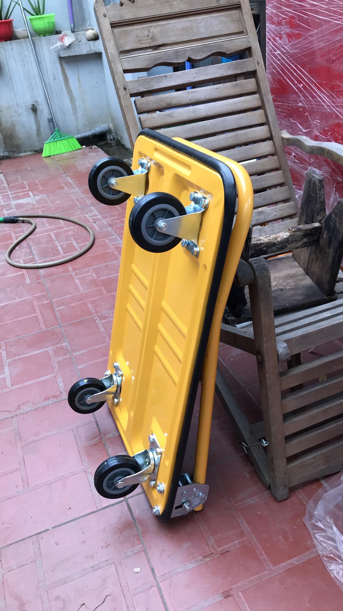 Xe được ứng dụng để chở hàng hóa, chở tiền Kiểu xe: xe đẩy sàn nhựa gấp gọn Kích thước : 600 x 900 x 860mm Đường kính bánh xe: 125mm Tải trọng: 300kg Trọng