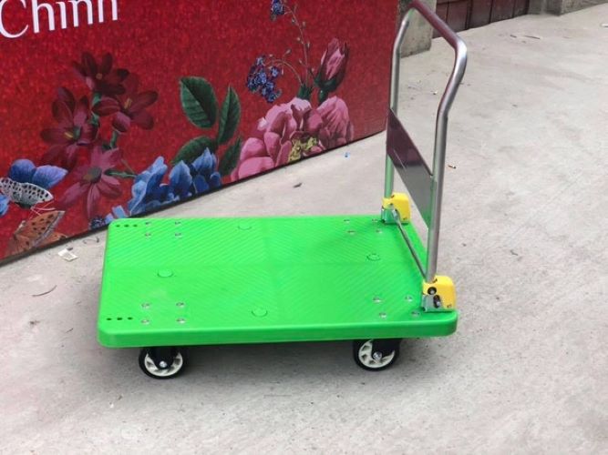 Xe được ứng dụng để chở hàng hóa, chở tiền Kiểu xe: xe đẩy sàn nhựa gấp gọn Kích thước : 600 x 900 x 860mm Đường kính bánh xe: 125mm Tải trọng: 300kg Trọng