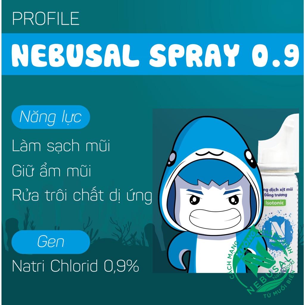 - Công nghệ bình xịt BOV tiên tiến từ Đức. Công dụng : Nước muối biển Nebusal giúp làm ẩm khoang mũi cho người lớn và trẻ nhỏ. Sản phẩm giúp duy trì hoặc khôi phục lại sự cân bằng sinh lý của niêm mạc. Sản phẩm được sử dụng trong các trường hợp sau đây: Dung dịch xịt mũi Nebusal spray 0.9% là dung dịch đẳng trương dùng để vệ sinh mũi hàng ngày. Rửa mũi, làm sạch dịch nhày trước khi sử dụng các thuốc xịt mũi khác. Rửa sạch các chất gây dị ứng, bụi bẩn, phấn hoa… Vệ sinh mũi sau khi làm việc hoặc đi đường bụi bẩn. Công nghệ bình xịt hiện đại