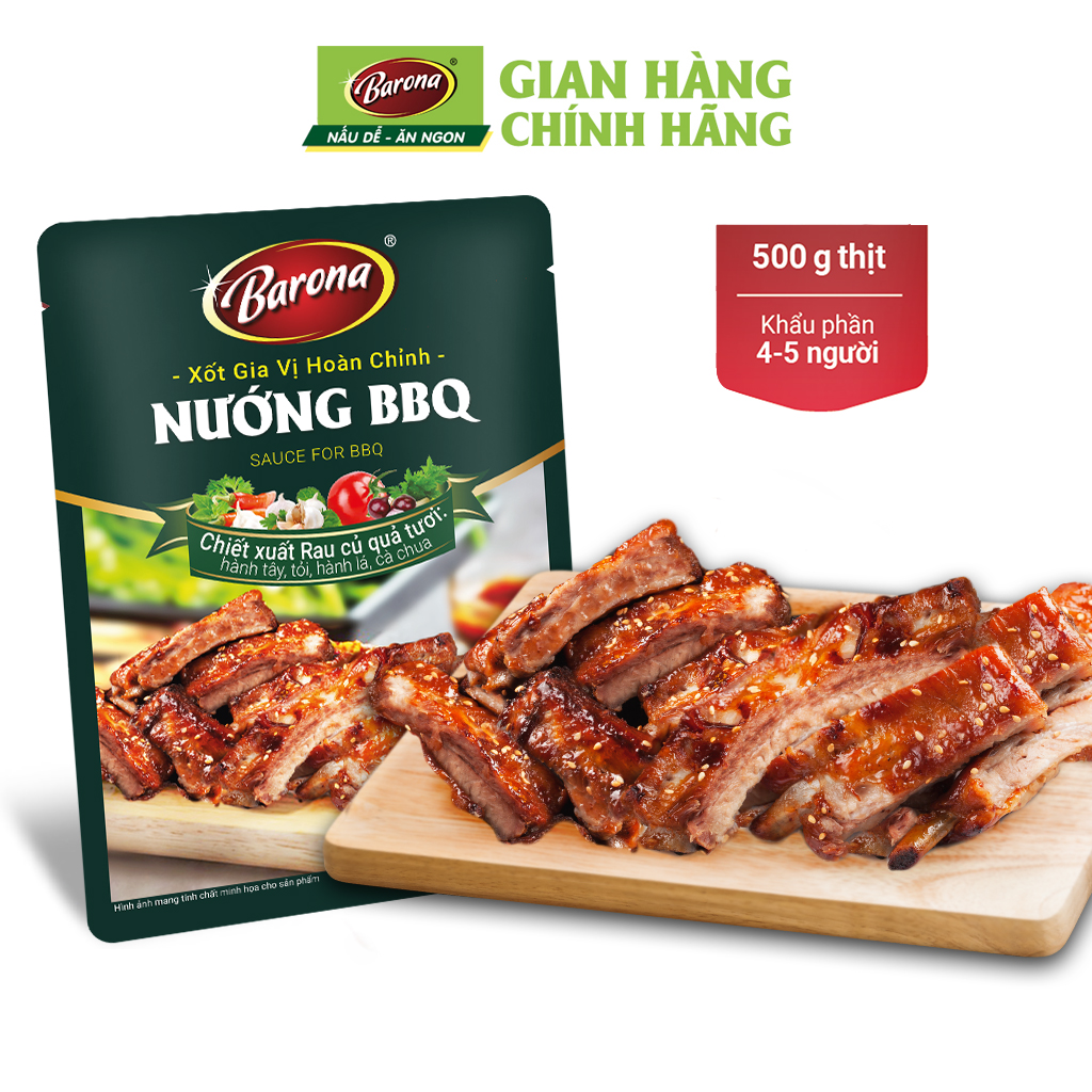 Mua tại TiktokXốt Gia Vị Hoàn Chỉnh Barona - Nướng BBQ là công thức phối trộn độc đáo giữa chiết xuất rau củ quả tươi như: Hành tây, tỏi, hành lá, cà chua… cùng các loại gia vị truyền thống và thành phần mật ong nguyên chất được chọn lọc, đem đến món ngon chuẩn vị mà không cần nêm nếm thêm, vô cùng nhanh và tiện cho MÓN NGON TẠI GIA hay TIỆC TẠI NHÀ nhanh chóng. *ĐIỂM MẠNH: Chiết xuất Rau củ quả TƯƠI Sản phẩm Không thêm chất bảo quản Ướp ngon, vị chuẩn, không cần nêm nếm Đạt Hàng Việt Nam Chất Lượng Cao
