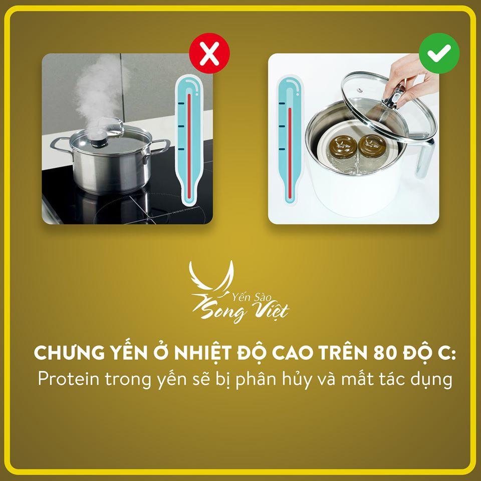 4. Chưng cách thủy 30 phút là dùng được HƯỚNG DẪN BẢO QUẢN YẾN SAU KHI CHƯNG Thời hạn bảo quản trong ngăn mát tủ lạnh (7-15 độ C) là 7 ngày Thời hạn bảo quản ở nhiệt độ thường là 24 tiếng LIỀU LƯỢNG VÀ CÁCH DÙNG Một người bình thường chỉ nên ăn một phần yến mỗi ngày (1,5 g yến khô, tương đương với 80 ml yến chưng) Trẻ em dưới 12 tuổi, phụ nữ có thai và cho con bú, người đang điều trị bệnh nên tham khảo ý kiến bác sỹ hoặc chuyên gia dinh dưỡng trước khi sử dụng Dùng đều đặn mỗi ngày và dùng vào một khung giờ nhất định để đạt hiệu quả tốt nhất Thời điểm dùng yến tốt nhất là sáng sớm sau khi ngủ dậy hoặc 1 tiếng trước khi đi ngủ ĐIỀU GÌ KHIẾN YẾN SÀO SONG VIỆT TRỞ NÊN KHÁC BIỆT? Không bán yến tổ, chỉ bán yến tinh chế chia theo khẩu phần, mỗi khẩu phần 1,5 g yến khô: xây dựng thói quen ăn đều ăn đủ, ăn theo khoa học, tránh bị thừa đạm do ăn quá nhiều yến và gây lãng phí do cơ thể không hấp thu được hết chất dinh dưỡng; Yến nguyên chất 100%, không chất bảo quản, không chất phụ gia, không chất tăng trọng, không trộn lẫn bất kỳ tạp chất nào khác; Tùy chọn đường phèn hoặc đường ăn kiêng: giúp kiểm soát lượng đường dung nạp vào cơ thể phù hợp với thể trạng và bệnh lý của mỗi người; Quy trình khai thác yến, sản xuất, đóng gói, phân phối đến tay người tiêu dùng là một quy trình hoàn toàn khép kín, do chúng tôi kiểm soát 100%, không có sự can thiệp của bất kỳ bên trung gian nào. VÌ SAO PHẢI CHIA YẾN THÀNH KHẨU PHẦN? Giúp kiểm soát hàm lượng yến ăn mỗi ngày đều nhau Khách hàng không phải bẻ gãy yến làm yến bị vụn, nát, hàm lượng không chính xác, ngày ăn nhiều, ngày ăn ít; không đảm bảo an toàn VSATTP Giúp nâng cao nhận thức của khách hàng về việc ăn đều ăn đủ
