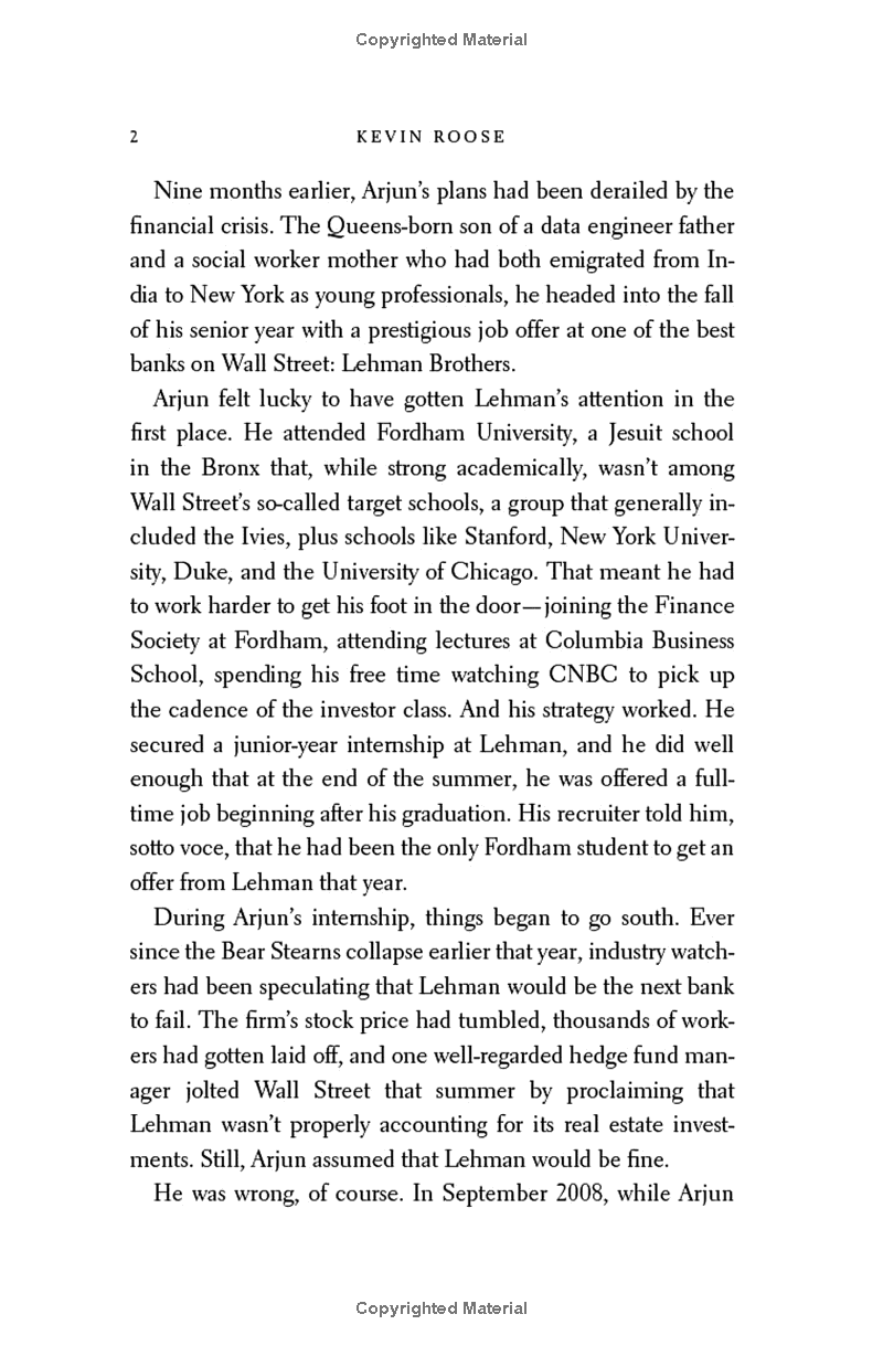 Roose's young bankers are exposed to the exhausting workloads, huge bonuses, and recreational drugs that have always characterized Wall Street life. But they experience something new, too: an industry forever changed by the massive financial collapse of 2008. And as they get their Wall Street educations, they face hard questions about morality, prestige, and the value of their work.